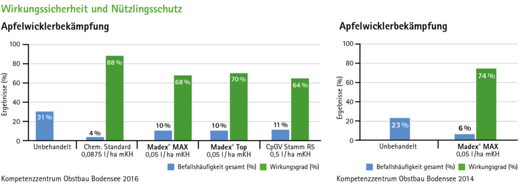 Die Madex Granulovirus-Isolate Madex® MAX und Madex® Top erzielen höchste Wirkungsgrade gegen Apfelwicklerpopulationen. Madex® MAX und Madex® Top sind hochselektive, biologische Schädlingsbekämpfungsmittel auf der Basis eines spezifischen, natürlichen Insektenvirus (Granulosevirus). Kurz nach der Aufnahme tritt ein Fraßstopp ein, somit ist die Pflanze vor weiteren Fraßschäden geschützt. Mit der Erweiterung durch das neue Isolat Madex® Top wird das Resistenzmanagement verstärkt, denn somit ist für jeden Standort das passende Isolat verfügbar.